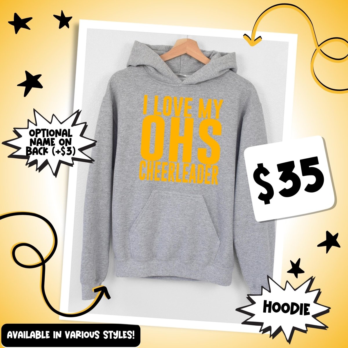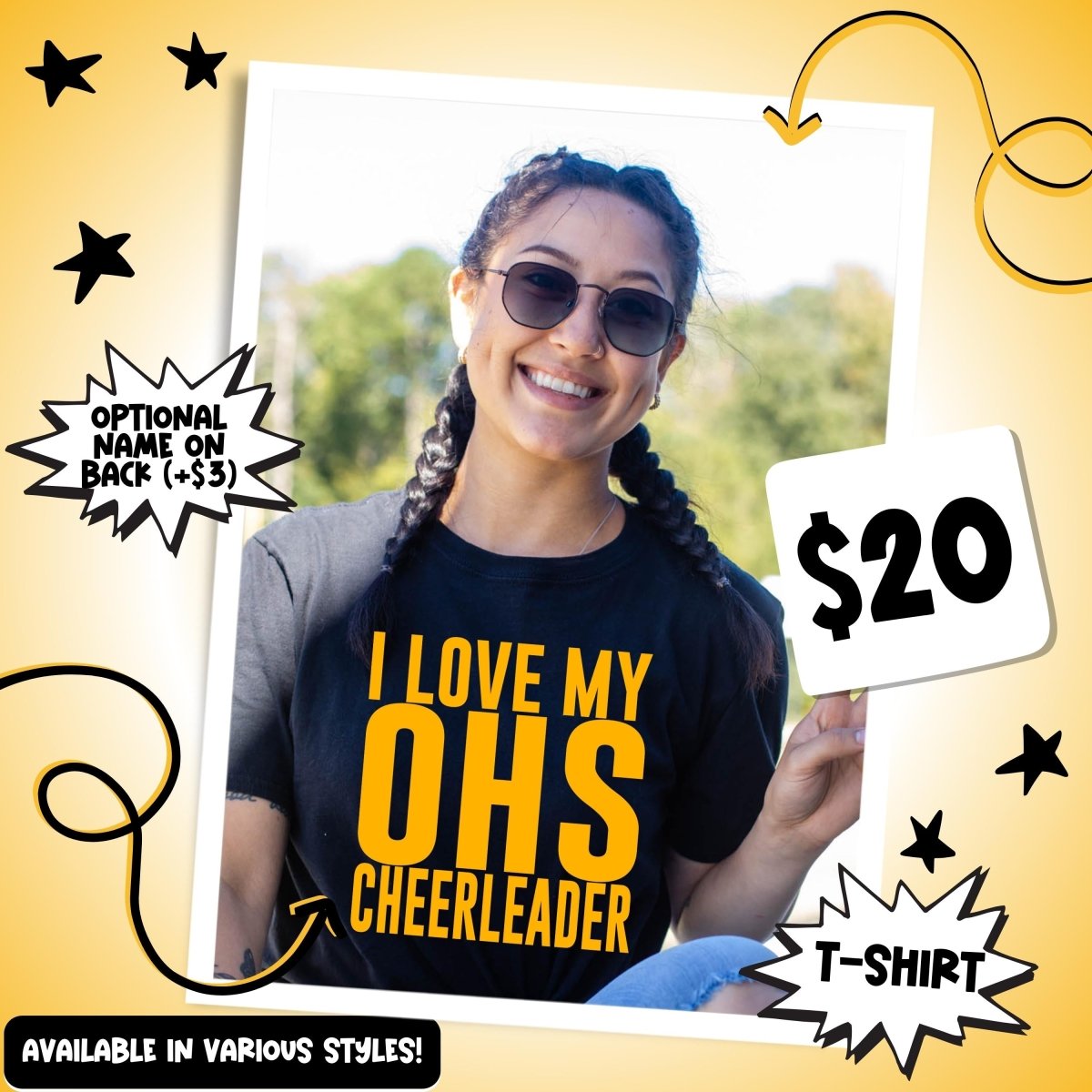 With each purchase, you're contributing to our fundraiser, helping us achieve our goals and support our cheerleaders. These shirts proudly feature "I LOVE MY OHS CHEERLEADER" with the option to add the last name on the back (Additional $3).